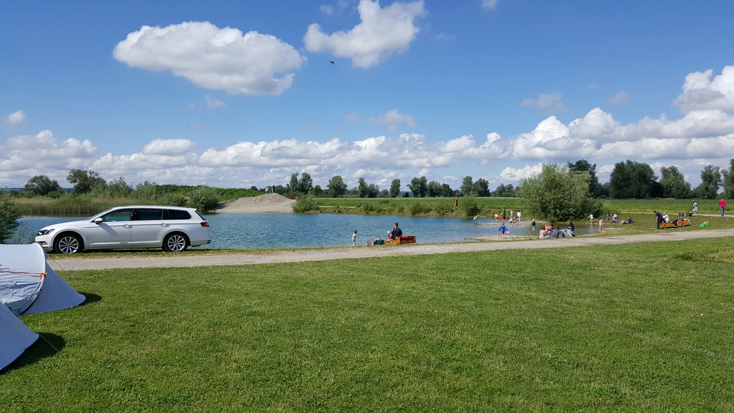 Unser Stellplatz ist gerade, die Parzellen sehr großzügig. Und man wird mit etwas Grünbewuchs vom Nachbarn getrennt. Der Eigentümer hat hier einen kleinen See zum Baden angelegt, dieser lädt richtig zum abkühlen und plantschen ein. Hunde sind erlaubt und müssen wie an jedem Platz angeleint sein. Strom (16A) zahlt man hier pauschal pro Tag. Bei Starkregen sind die Schotterwege nicht so schön, aber es passt nun mal zum Hof Flair.