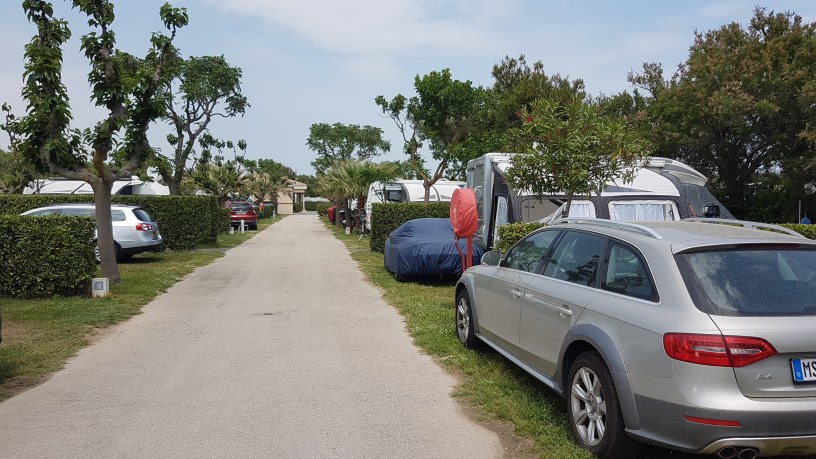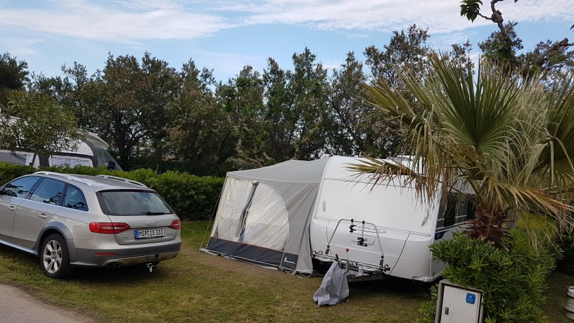 Strom haben wir 10 Ampere genommen, kostet allerdings Aufpreis (normal sind hier 6 A). Wasser und auch Abwasser sind direkt am Platz. Leichten Schatten bekommen wir auch durch kleine Bäume. Bisher ist das Wetter Ok, aber für das Baden im Meer ist es noch zu frisch.