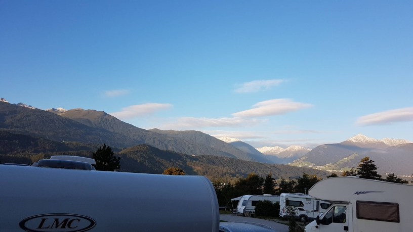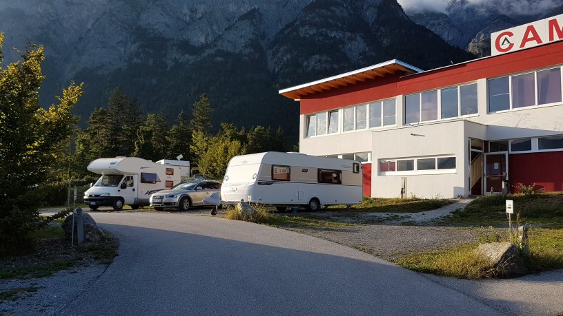 Der Platz liegt leicht am Berg und am Empfang wurde mir gesagt, sucht euch einen Platz aus und dann kommt Ihr wieder vorbei wenn Wohnwagen gestellt und am Stromnetz ist. Gesagt, getan! Die Plätze sind leicht schräg und ich musst über die Deichsel sehr hoch ausgleich damit der Vivo gerade steht. Sanitäranlagen kurz gecheckt, sauber! WLAN ist auch hier kostenfrei, allerdings muss man höflich nach dem Code bitten. Zum Platz gehört auch ein Lokal Namens Garda… passt doch! Zum Einstimmen haben wir uns am Abend gleich mal eine Pizza geholt, sehr lecker. Auch viele Einheimische haben diese Lokal aufgesucht. Gut es war Sonntag Abend. Ab und an startete und landete ein Flugzeug das war schon störend, aber ab 22:15 Uhr war es bis Morgens still. Also für eine Zwischenübernachtung kann man diesen Platz getrost nutzen. Für länger wäre es uns zu laut durch Flug & Zug Lärm.