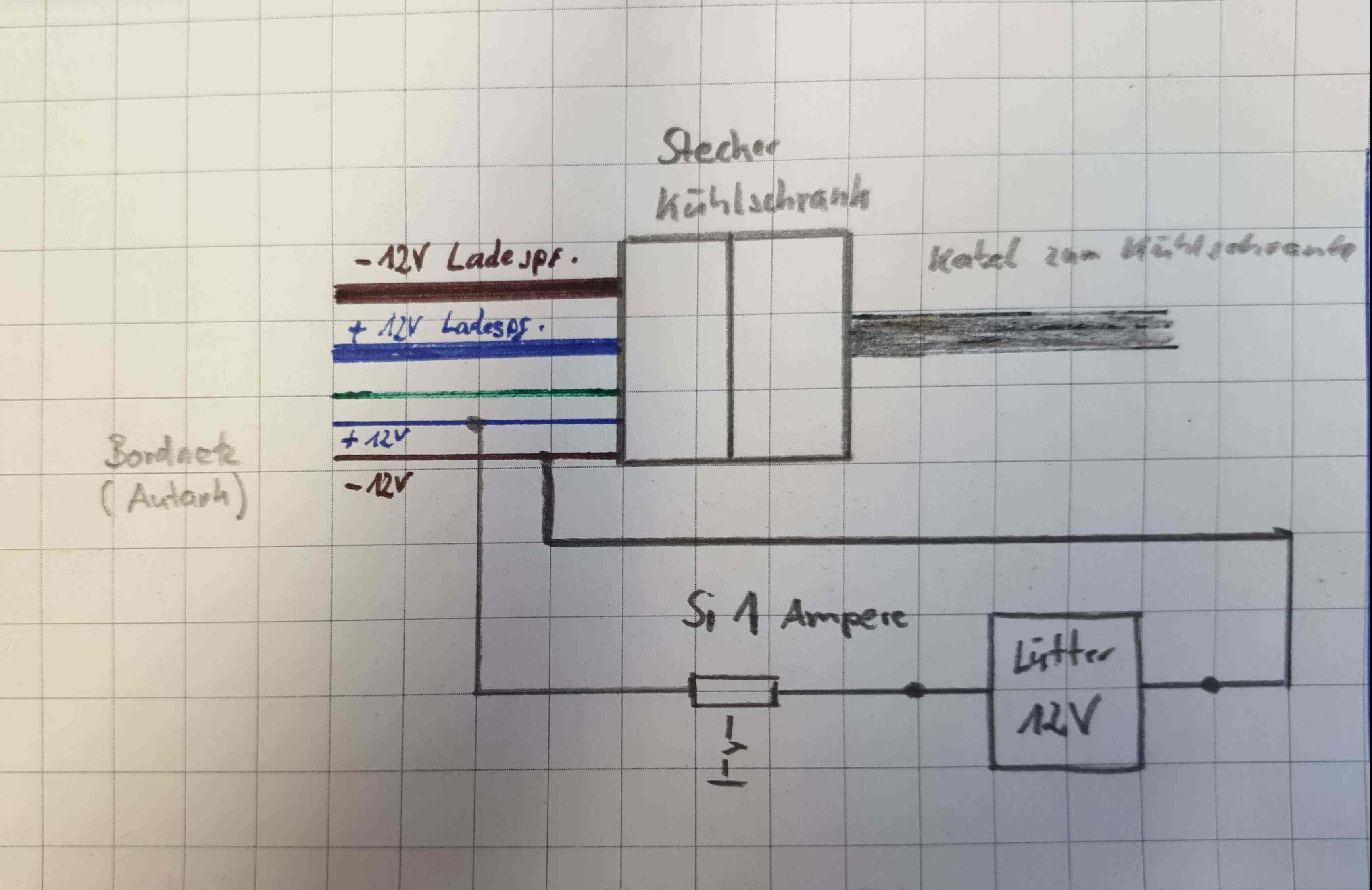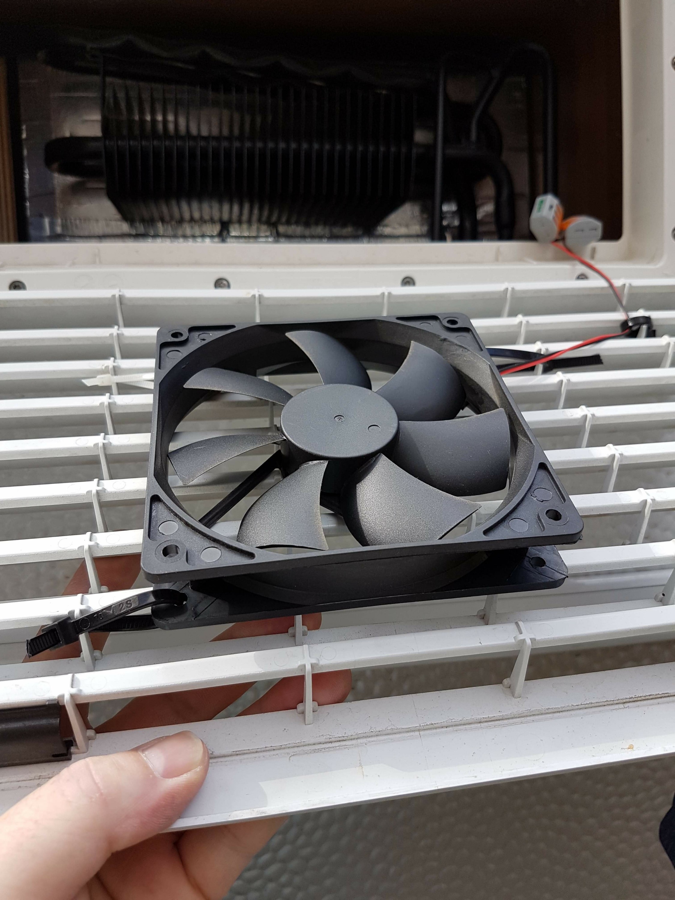 Ich habe die Zuleitung (blau ist + und braun ist – 12V) getrennt mit einem Seitenschneider und etwas abisoliert. Aufpassen: Nicht die Ladeleitung nehmen. Nun habe ich alles verklemmt und geprüft, wichtig ist dass man den Lüfter so einbaut dass die Luft nach Außen geblasen wird. Bei mir ist der Lüfter nur mit Kabelbindern am Lüftungsgitter fest gemacht. Billig, hält und man kann es Rückstandslos wieder entfernen. Bei meiner Version muss man zum Einschalten das Lüftungsgitter entfernen, nicht ganz praktisch. Jedoch will ich mir noch ein Thermostat zu legen dass den Lüfter automatisch steuert. Kostet bei Ebay 10€. Jedoch kommt das Teil aus China und lässt auf sich warten.